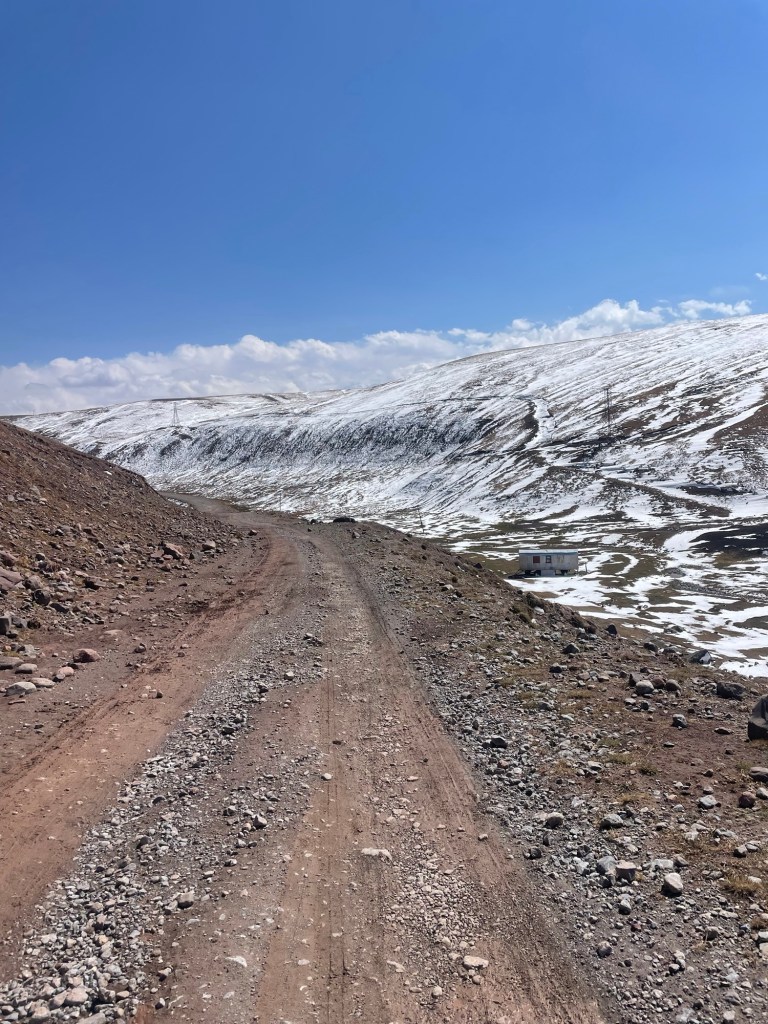 Hoewel ik boven 3000 meter tussen heuvelachtige, bepoederde bergtopjes klim, voelt het al snel warm aan doordat de zon van tussen de wolken komt gluren. Vandaag ben ik opgetogen, al doe ik het ook een beetje in mijn lange broek voor de grenspost die eraankomt. Allerlei spullen zouden er niet doorheen mogen.
