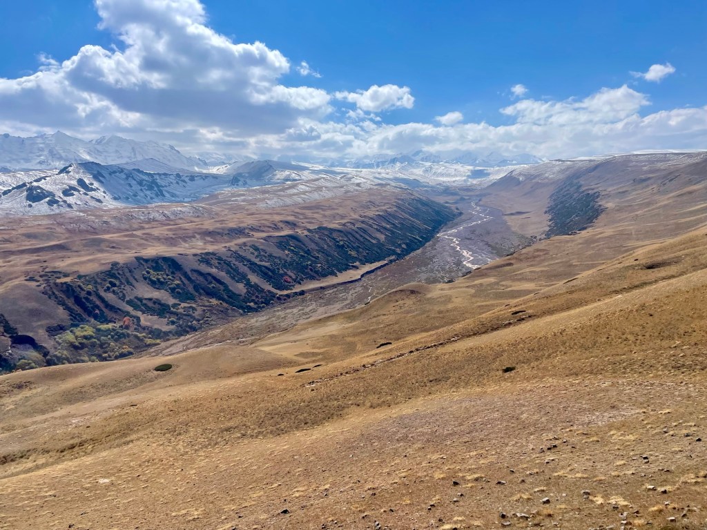 Na meer dan 20 km in het no man’s land verschijnt dan eindelijk de Kirgizische grenscontrole, veel moderner dan de Tadzjiekse. De stompe toppen voor me wekken de indruk dat het scherpe hooggebergte nu voorgoed achter me ligt. Zover als ik kan zien, groeit er geel gras. Dat ik de vredige afdaling vandaag met zon en zicht kan afleggen, bevestigt wel dat het de juiste keuze was om gisteravond bij de soldaten te blijven.