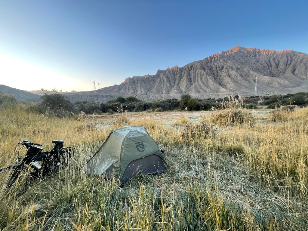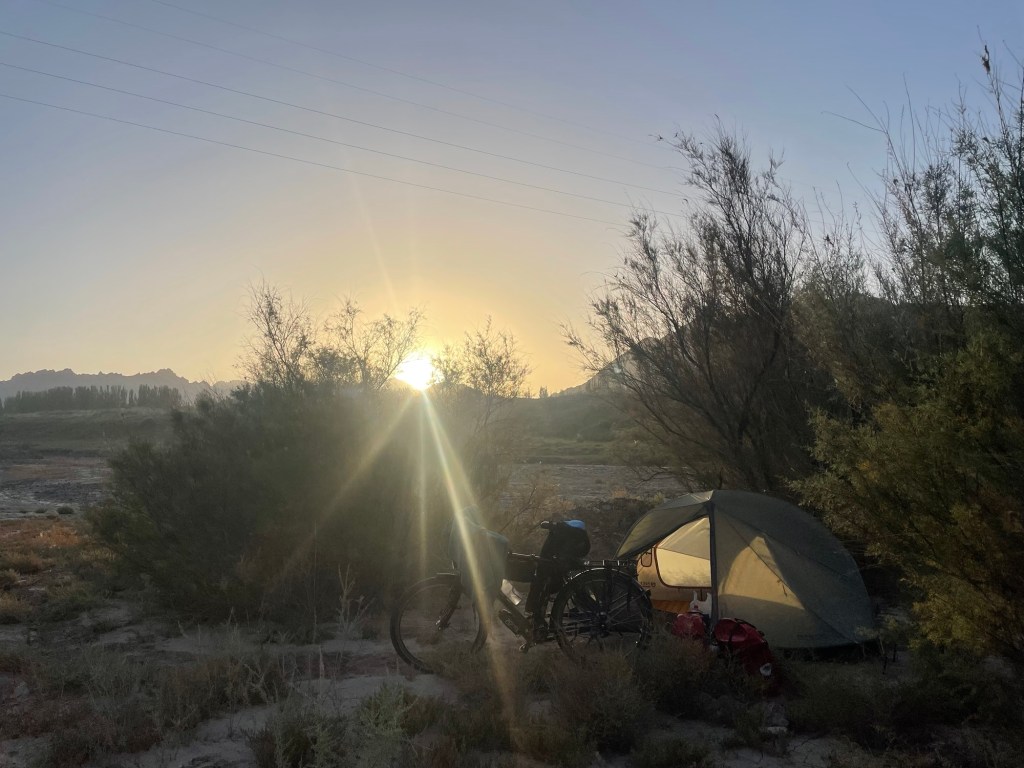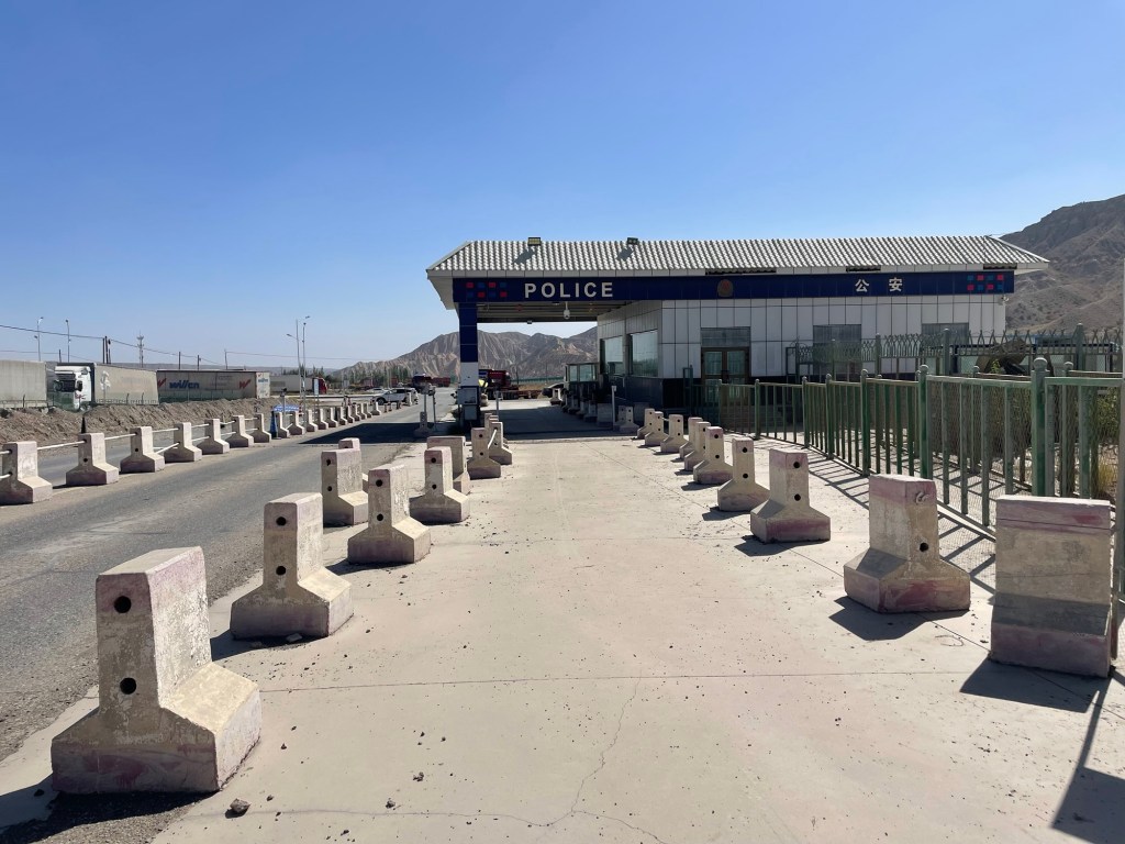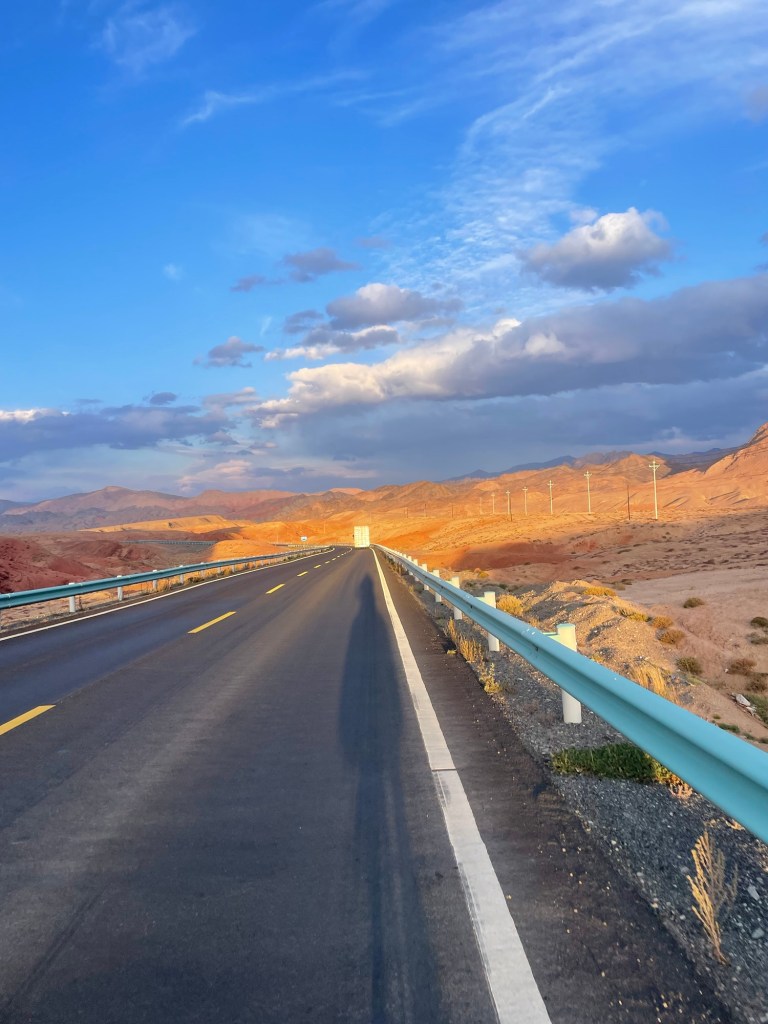 Vandaag rij ik de eerste van twee hele ritten door Xinjiang, voor de fietser naar verluidt een bloedenerverende politiestaat. De eerste agent die ik zie, geef ik een vriendelijk saluut, maar hij doet niks terug. De eerste politiewagen die me inhaalt, rijdt gewoon verder. Misschien ben ik door mijn rode tassen tussen de rode bergen onzichtbaar. Volgens voorgangers zou je hier op een dag tot wel 10 keer tegengehouden worden voor een paspoortcontrole. Vaak volgt dan ook nog een escorte, of erger, een taxiservice van tientallen kilometers zodat jij, als onvoorspelbare vreemdeling op de fiets, niet langer een probleem vormt binnen die politiezone.