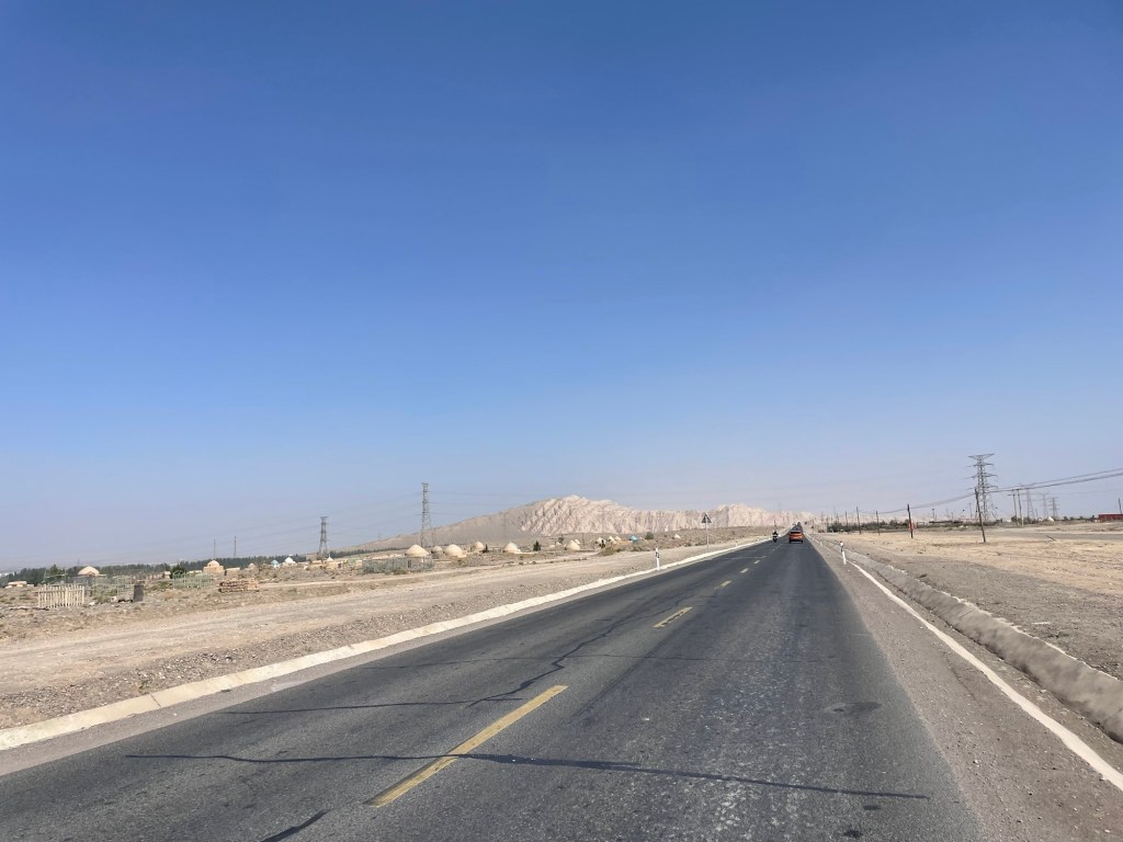 Bij alweer een controle steek ik mijn paspoort al uit naar de agent, maar hij hoeft het niet te zien voor de verandering. Dan gaat het in een keer tussen twee reuzehoge taluds door en heb ik het gevoel dat ik opnieuw door een woestijn rij. Boven toegekomen wordt dat beeld nog meer bevestigd door een bruine vlakte en links een Oeigoerse begraafplaats met unieke bolvormige tombes.