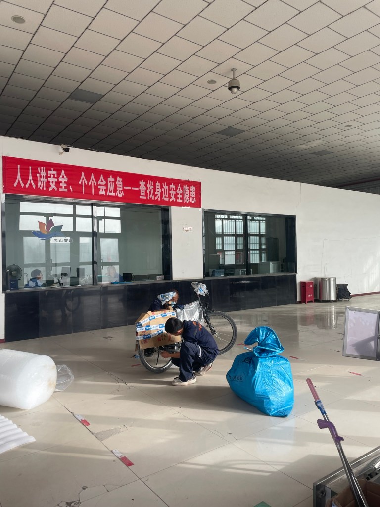 Stampvol noedels stap ik op om 500 meter verder weer af te stappen. Paspoortcontrole. Het landschap wisselt de hele tijd af tussen kale, gegroefde bergwanden en aangeplante populierendreven. Maïskolven liggen met hopen te drogen in de zon. Verlichtingspalen torsen hele kroonluchters. Over de eindeloos rechtdoor lopende weg bol ik harder dan de Chinezen op hun elektrische scootertjes