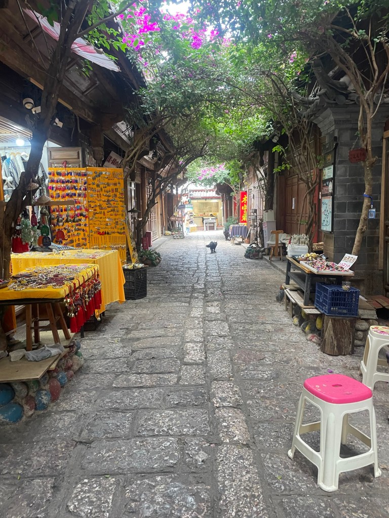 Lijiang blijkt iets te weinig shangri en iets te veel la la la. Lalalai is Chinees voor kom, kom kom, als in kom maar kopen, geef je geld uit. De oude stad, het toeristische centrum, heeft een oppervlakte vergelijkbaar met een Vlaamse provinciestad. En wat er dan zo onvoorstelbaar aan is, is dat de Chinezen er toch in geslaagd zijn om bijna elke straat van dat hele pretpark om te toveren in een commerciële doolhof van eetkraampjes, fruitverkopers, souvenirwinkels, fotostudio’s, cakeshops, koffiehandelaren, nougatkramen, rijstwijnslijterijen, theehuizen, porseleinwinkels en dan vergeet ik nog wel wat, maar in alle straten komen precies dezelfde shops terug. Zo overkomt het je meermaals dat je denkt, ‘hè, hier was ik al’, maar dat klopt dan niet.