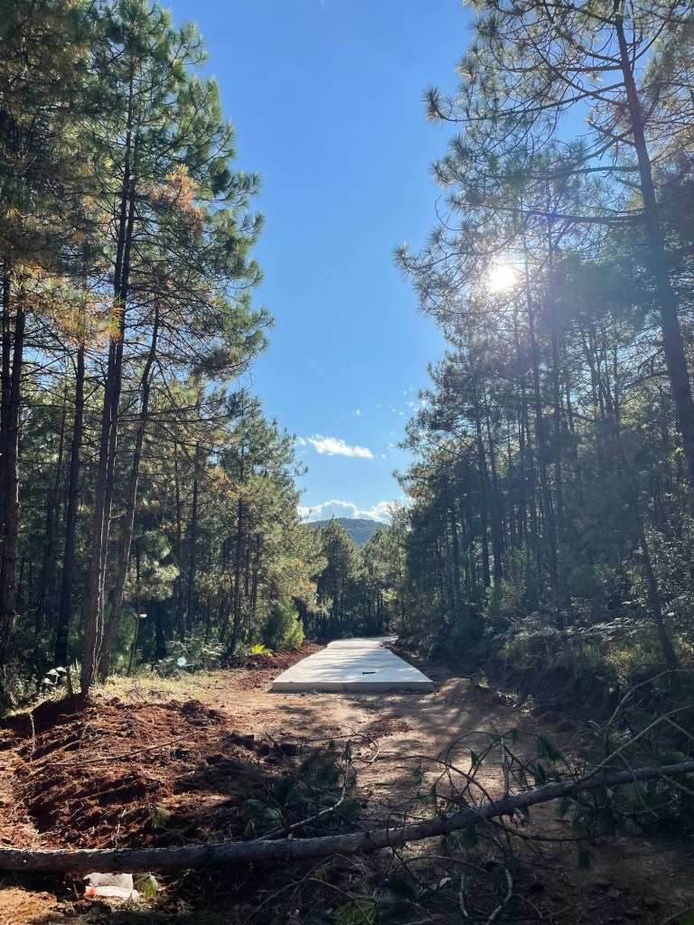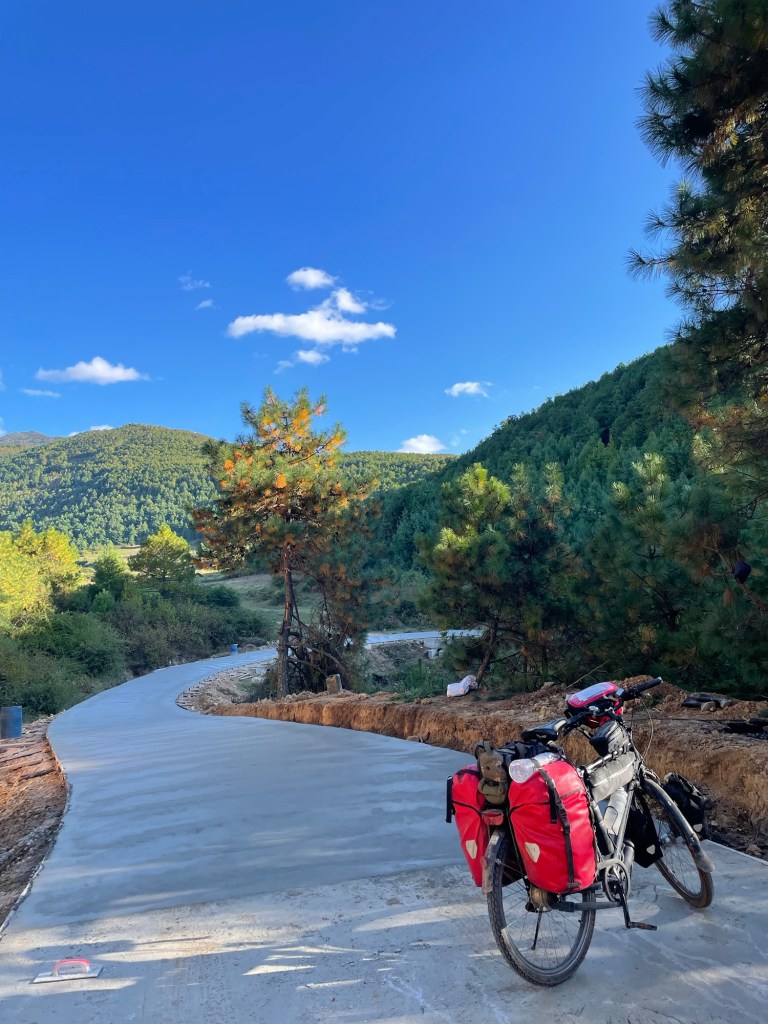 Het wordt hoe langer, hoe meer acrobatie door modder en klei, die vast komt te zitten tussen spatbord en band. Het mondt uit in zo’n moordende boscol dat mijn ribben ervan steken en mijn benen schreeuwen om redding. Tegelijkertijd doet het deugd om nog eens een onverhard avontuur te rijden. Boven gaat het plat tussen ranke pijnbomen en varens. Had je me hier gedropt en mijn blinddoek afgenomen, ik had gedacht dat ik in Vlaanderen stond. Enkel de karakters op het zwerfvuil verraden waar ik fiets. Na nog geen kilometer remmenknijpen verschijnt er nagelnieuw beton, deus ex machina.