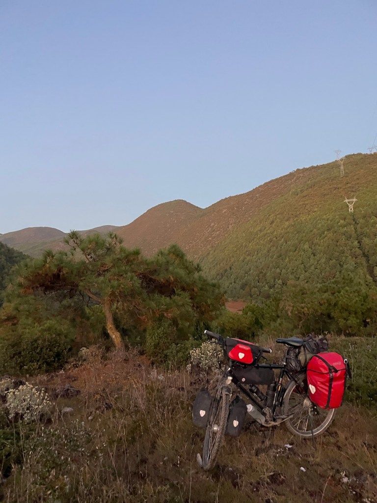 Blijvend op zoek tussen tuinbouw vat ik nog een klim aan. In een bocht krijg ik zicht op een landschap zo ruig dat zelfs de Chinezen het niet konden bewerken. Dan is het ruig. Een plekje zoeken tussen alle scherpe stenen en het struikgewas moet al in het licht van de wassende maan. Vandaag ben ik bijlange niet geraakt waar ik wilde, maar het geeft niet, want ik slaap onder de sterrenhemel op 3000 meter met weer een prachtige rit achter de rug. De weemoed van gisteren slaat om in een diep gevoel van geluk.
