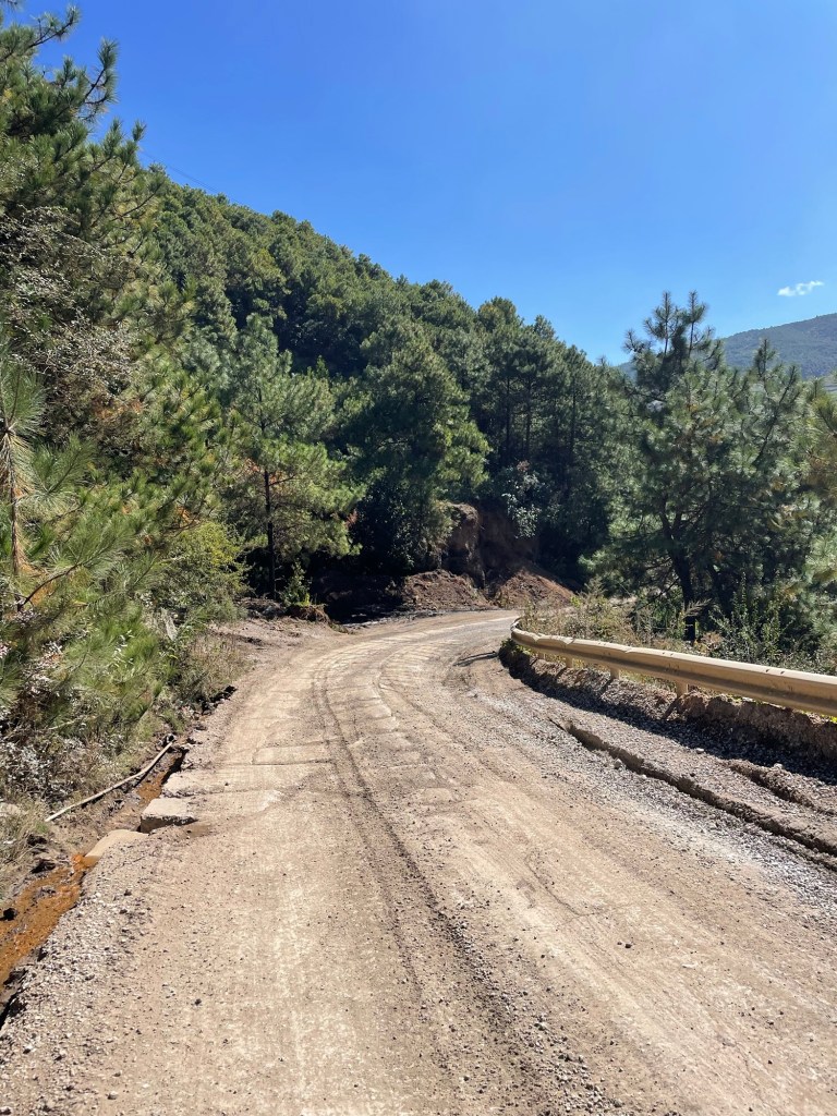 Ik keek uit naar een lange, vlotte afdaling maar dat valt tegen. De weg ligt er onchinees vreselijk, in stukken gebarsten bij en bolt voor geen ene meter. Eindelijk beneden gaat het meteen weer door een tsjirpende halfjungle waarin lianen en dennentakken met elkaar zijn verstrengeld en waar appels en bananen naast elkaar hangen te blozen. Een wandelende tak wordt ei zo na verpletterd door mijn banden.