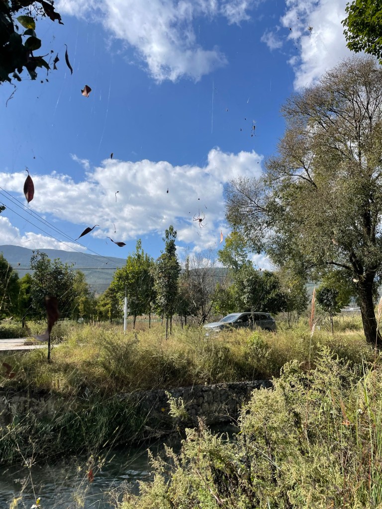 Eens op de vlakte, tracht ik op een rustige parallelweg tegen de wind in meer dan 20 te trappen want Dali is nog ver en het uur al laat. Grote groene en rode spinnekoppen hebben er webben gesponnen tussen de boompjes langs het pad. Sommige ragenetten zijn wel een meter in doorsnede, andere zo verstrikt dat je je afvraagt hoe ze er zelf nog uit komen. Helaas pakt rag niet prachtig op foto.