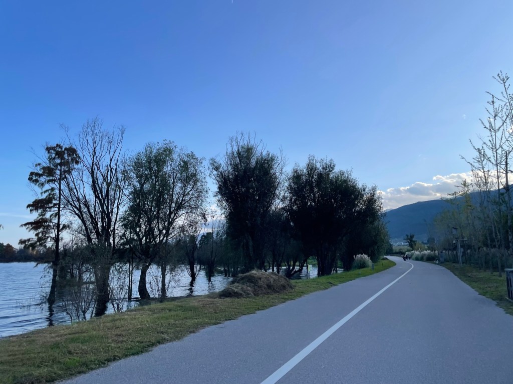 Langs het piekfijne fietspad ligt een retestrak en langgerekt park. Van tussen twee bergtoppen zet de avondzon de overkant nog knap in de kijker en schenkt ze haar laatste warmte. Ook de Chinezen fietsen het meer af, elk op een kinderformaat met vooraan een plastic mandje met valse bloemen in. Ze zien er geen been in om zichzelf filmend van links naar rechts te zwalpen over het 5 meter brede pad. Met mijn fietsbel rinkel ik de gelegenheidsfietsers aan de kant. Daar zullen die toetermaniakken niet van terughebben.