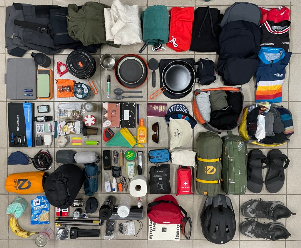 Heel veel en tegelijk heel weinig. Onder langeafstandsfietsers lijkt de trend tegenwoordig vooral ‘lightweight’. Mijn motto is eerder ‘liever te veel bij dan te weinig’. Ik ben graag goed voorbereid, maar uiteindelijk moeten al die spullen nog steeds passen in 4 tassen. Naast essentials als een tent, een slaapzak en kledij neem ik een halve boedel aan kampeerspullen mee: kookgerief, elektronica, reparatiemateriaal, toiletspullen, gadgets, ehbo, een stoel en ga zo maar door.
